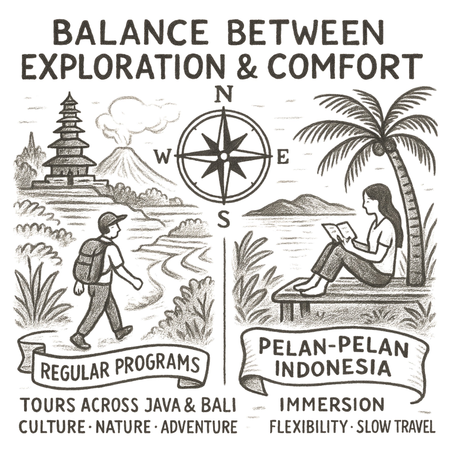 Autica bridges the gap between conventional travel needs and transformative travel experiences. On one side, regular programs offer curated, comfortable tours across Java and Bali (cultural trips, nature tours, adventure activities, island hopping, etc.). On the other, “Pelan-Pelan Indonesia” offers a more immersive, flexible, and open-ended way of exploring—inviting curious minds to go beyond sightseeing and step into co-creation, learning, and slow living.